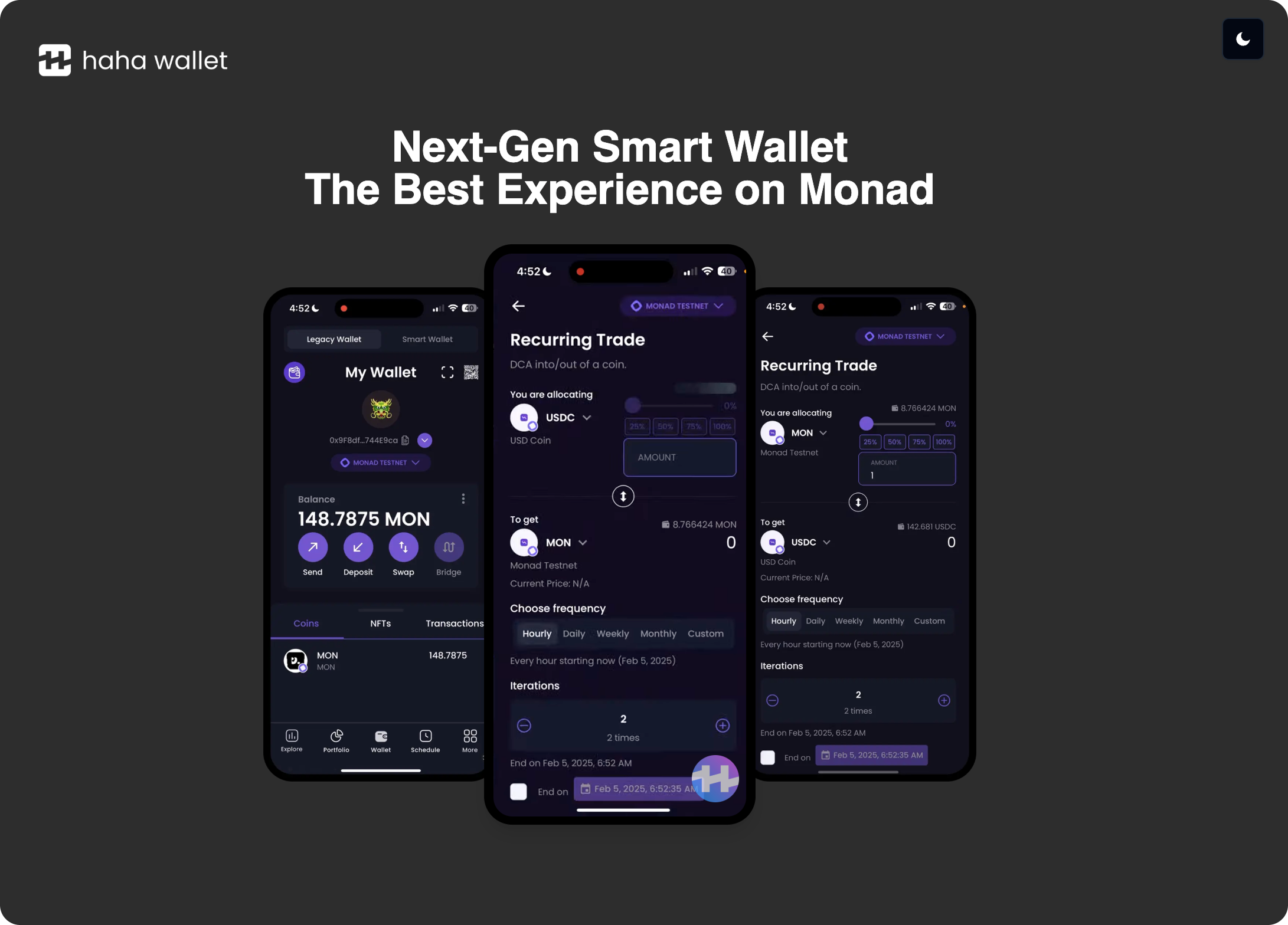 HaHa Wallet is a Monad-native smart wallet powered by Account Abstraction. Thanks to Monad, HaHa Wallet features blazing-fast transactions and near-instant confirmation. With seamless integration with all the top apps on Monad, users get a seamless experience across their crypto journey.
